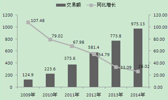 據(jù)前瞻產(chǎn)業(yè)研究院發(fā)布的《 2015-2020年互聯(lián)網(wǎng)對(duì)中國(guó)化妝品零售行業(yè)的機(jī)遇挑戰(zhàn)與應(yīng)對(duì)策略專項(xiàng)咨詢報(bào)告》數(shù)據(jù)顯示,網(wǎng)購(gòu)化妝品交易額從2009年的124.9億元到2014年的975.1億元。短短五年時(shí)間實(shí)現(xiàn)了一個(gè)大的翻越, 2013年較2012年增長(zhǎng)192.4億元,同比增長(zhǎng)33.09%;2014年較2013年增長(zhǎng)201.3億元,同比增長(zhǎng)26.02%。