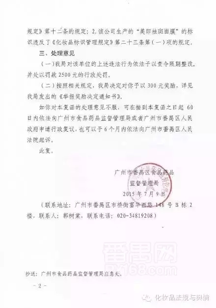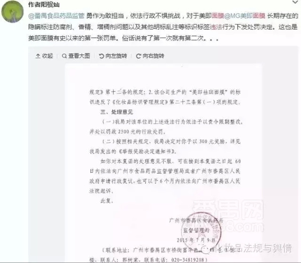 近期,經(jīng)消費者舉報,番禺區(qū)藥監(jiān)局對美即面膜未全成分標注、標識標簽誤導(dǎo)消費者等違法行為下發(fā)處罰決定。廣州美即化妝品有限公司被處責(zé)令限期整改,并被處以罰款2500元。